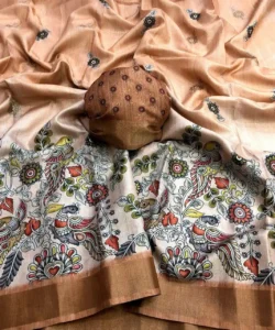 Crafted in elegant Fancy Tussar Silk( peach), this saree features a striking Kalamkari digital print that beautifully merges tradition with contemporary charm. The look is enhanced with a woven border, tassel detailing on the pallu, and a contrast printed blouse to complete the ensemble. Ideal for festive wear or casual elegance.